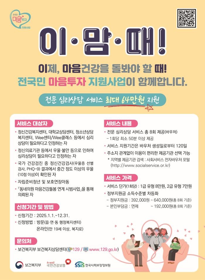 ¸¶À½ÅõÀÚ Áö¿ø»ç¾÷Àº Àü¹® »ó´ã»ç¿¡°Ô ½É¸®»ó´ã ¼ºñ½º¸¦ ÃÑ 8ȸ Á¦°ø¹ÞÀ» ¼ö ÀÖ¾î¿ä!